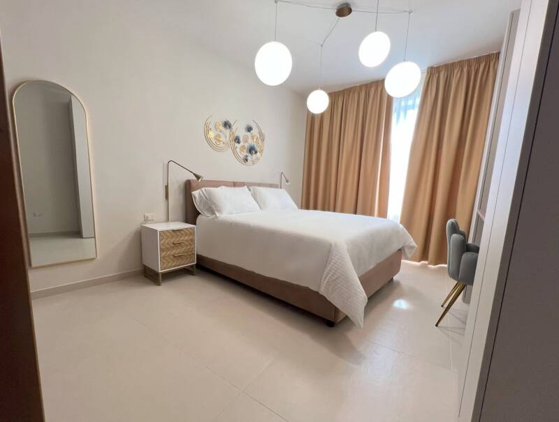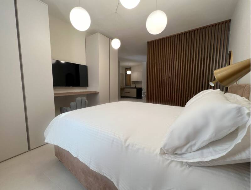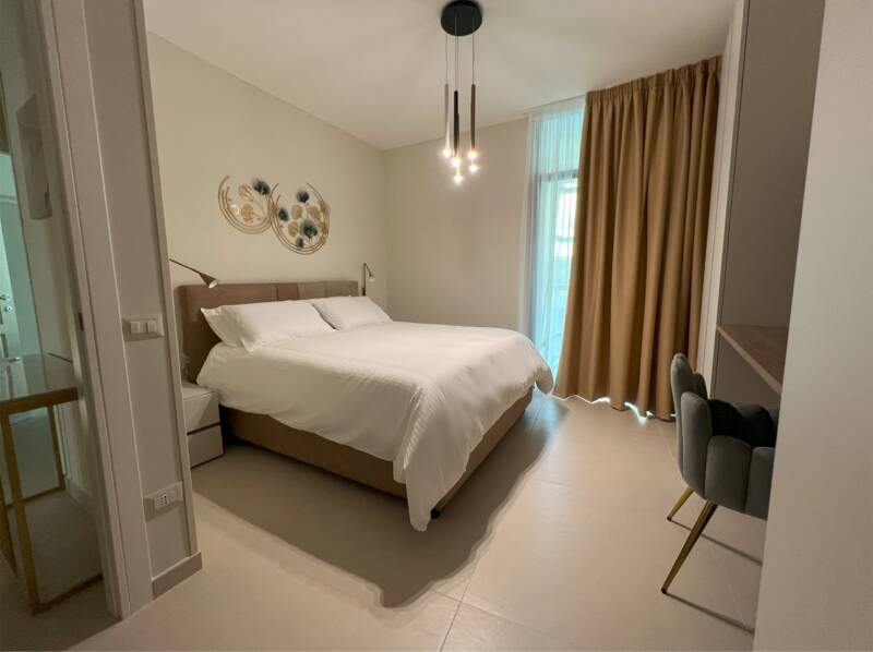 Appartamento posto al piano terra della struttura, atto a ospitare 4 persone, letto matrimoniale e divano letto. Qui è presente l'angolo cottura con piano ad induzione, frigorifero, macchina da caffè, bollitore, forno a microonde.